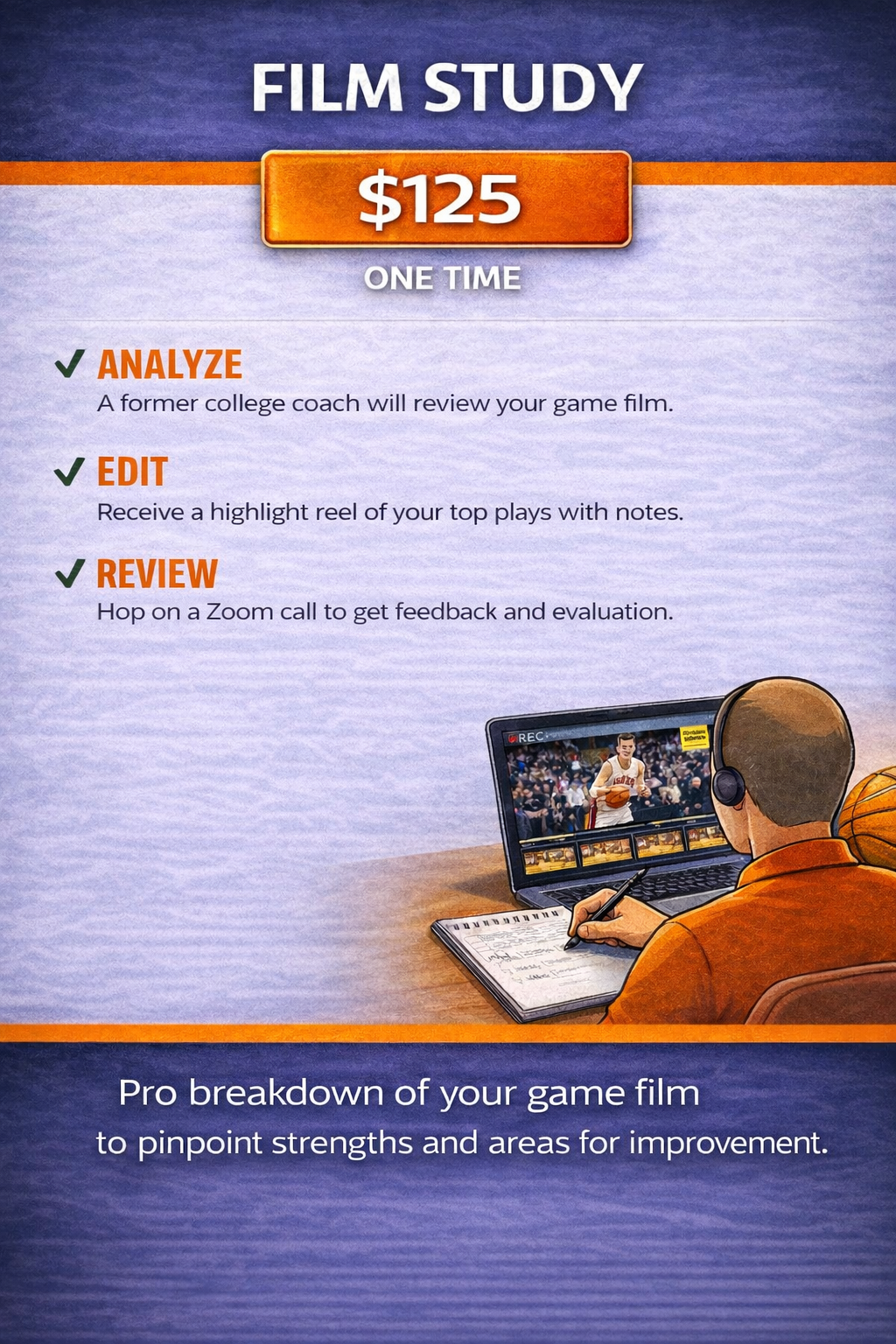 A Former College Coach Will Carefully Analyze A Full High School or AAU Game(s) & Pull Out Clips Of Good Plays As Well As Areas Where Improvements Need to Be Made To Grow Your Game.
